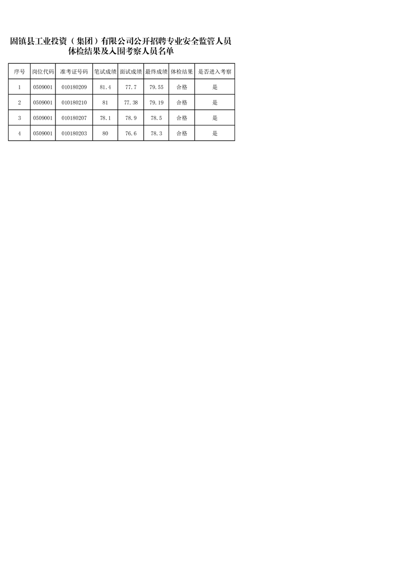 根據(jù)《固鎮(zhèn)縣工業(yè)投資(集團)有限公司公開招聘專業(yè)安全監(jiān)管人員公告》規(guī)定,報考人員考試總成績由高分到低分順序,招聘崗位按1:1比例確定體檢和考察對象,體檢合格者入圍考察(具體名單詳見附件)。考察工作由招聘單位組織實施,請考生保持通訊暢通。