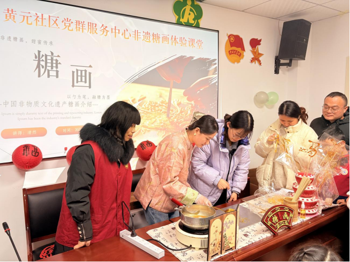 糖畫是中國民間傳統(tǒng)手工技藝的典型代表,通過熬糖、塑形等工序,將繪畫與雕塑結(jié)合,展現(xiàn)了古人的生活智慧,也承載著人們對傳統(tǒng)市集、街頭文化的溫暖回憶。2025年1月7日晚,黃元社區(qū)開展了一場“以勺為筆,融糖為墨”非遺糖畫體驗活動。本次活動吸引了近10戶親子家庭的參與。