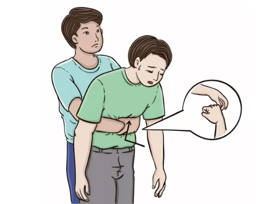 讓患者平躺,首先開放患者呼吸道,然后施救者騎跨在患者大腿外側(cè),一手掌根按壓肚臍上兩橫指處,兩手掌交叉重疊,連續(xù)快速用力的向后上方?jīng)_擊。