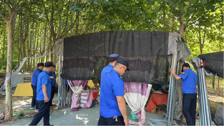 排查綠地變“牌場”。7月3日,執(zhí)法人員對驛馬湖兩側(cè)綠化帶開展拉網(wǎng)式巡查時(shí)發(fā)現(xiàn),湖岸約200米長的公共綠地上,被1處露天棋牌室占據(jù)——鋼骨棚架穿插綠植、遮陽網(wǎng)覆蓋棚頂、塑料布拴系樹間,部分桌椅直接壓占草坪,不僅破壞植被生長,更占用本供市民休息的公共綠地。市民反映“想散個(gè)步都擠不進(jìn)去,夏天連個(gè)歇腳的地兒都沒有”。