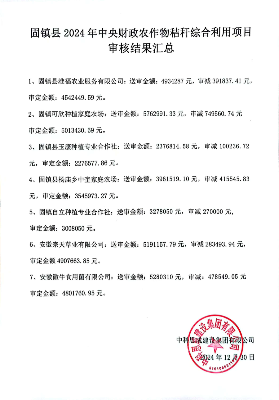 根據(jù)《固鎮(zhèn)縣人民政府關(guān)于印發(fā)固鎮(zhèn)縣2024年中央財政農(nóng)作物秸稈綜合利用項目實施方案的通知》(固政秘〔2024〕30號)和《固鎮(zhèn)縣財政局 固鎮(zhèn)縣農(nóng)業(yè)農(nóng)村局關(guān)于印發(fā)固鎮(zhèn)縣2024年中央財政農(nóng)作物秸稈綜合利用項目資金管理辦法的通知》(固財〔2024〕86號)文件精神,2024年7月3日,固鎮(zhèn)縣完成了中央財政農(nóng)作物秸稈綜合利用項目公開遴選工作,選定7個秸稈綜合利用主體實施此次項目,項目采取“先建后補”的方式,按照不超過項目總投資(依據(jù)第三方審計金額為準)的30%進行獎補,單個項目補助金額累計不超過300萬元。2024年12月12日,固鎮(zhèn)縣中央財政農(nóng)作物秸稈綜合利用項目專家組對2024年中央財政農(nóng)作物秸稈綜合利用項目進行了驗收,已完成驗收和第三方審計工作。經(jīng)項目實施主體申報,鄉(xiāng)鎮(zhèn)初審和縣級現(xiàn)場驗收,擬給予固鎮(zhèn)縣淮福農(nóng)業(yè)服務有限公司等7個項目承擔主體獎補,總計擬補貼資金747.13萬元?,F(xiàn)進行公示,公示期為五個工作日,公示時間2024年12月30日至2025年1月6日。公示期間如有異議,請及時向縣農(nóng)業(yè)農(nóng)村局、縣財政局反映。如無問題,將實行打卡發(fā)放。電話:0552-6058030(縣農(nóng)業(yè)農(nóng)村局),0552-6020065(縣財政局)。