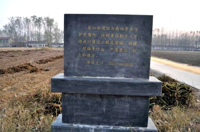 傳說春秋時期晉國上大夫俞伯牙曾在固鎮(zhèn)香山撫琴彈奏《高山流水》,與樵夫鐘子期結(jié)為知音。如今伯牙墓就坐落在固鎮(zhèn)湖溝鎮(zhèn)十里村香山廟自然村。還有傳說伯牙死后是從粉紅江漂到香山,后當(dāng)?shù)厝怂煸嶂?/span>如今,固鎮(zhèn)縣政府為了加強(qiáng)保護(hù),特意設(shè)立一個文物保護(hù)單位的標(biāo)志碑。俞伯牙墓冢與垓下、許慎讀書臺、谷陽城遺址一樣,已成為當(dāng)?shù)刂包c(diǎn)。