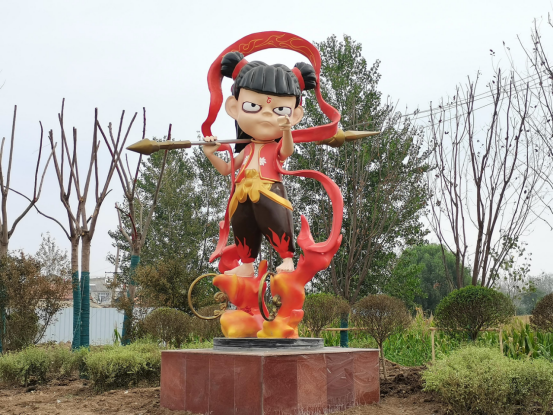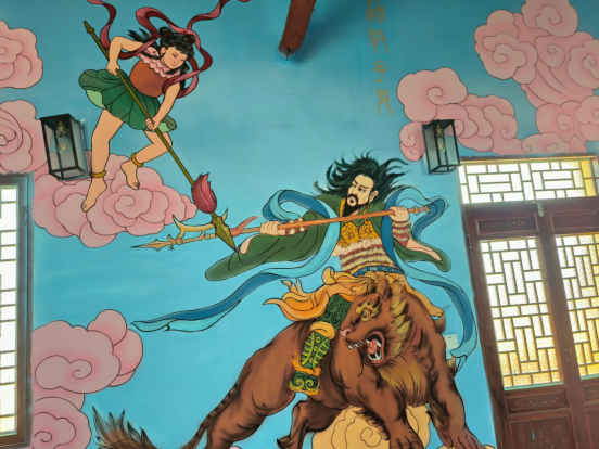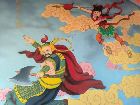 陳塘關(guān)鎮(zhèn)守李靖第三子哪吒,出世于肉蛋,7 歲時(shí)下河玩水,擺動(dòng)布兜兜, 頓時(shí)河水大作,驚動(dòng)青、白二龍。二龍遂出水大戰(zhàn)哪吒,敗逃?xùn)|海求援。東海龍王率蝦兵蟹將前來(lái)捉拿哪吒。哪吒手執(zhí)項(xiàng)圈、手鐲,取下布兜兜化作高墻,洪水始終漫不過(guò)高墻。龍王戰(zhàn)不過(guò)哪吒,便帶領(lǐng)青、白二龍?zhí)踊貣|海,老龍?zhí)稄拇似?/font>安無(wú)事。百姓為了紀(jì)念李氏父子,在陳塘關(guān)東門(mén)外建起七進(jìn)院落的陳塘關(guān)廟,塑有左手托起七級(jí)寶塔、右手按劍而立的托塔天王李靖神像,又在九灣集南興建哪吒廟,塑有三頭六臂的哪吒神像。哪吒橫眉怒目,注視河心,時(shí)刻提防青、白二龍來(lái)犯,以保護(hù)平民百姓。